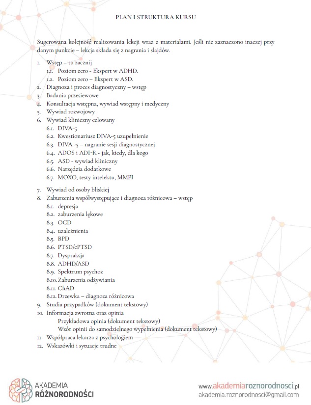 - kompleksowe podejście diagnostyczne – zgodnie z naszą wiedzą – to jedyne na rynku szkolenie pokazujące, jak w praktyce prowadzić kompleksową diagnozę dorosłego Klienta w kierunku ADHD i spektrum autyzmu. Nie uczymy diagnozy “pod jedno zaburzenie”, ale pokazujemy, jak zobaczyć człowieka szeroko i kompleksowo, zauważając dodatkowe wyzwania współwystępujące